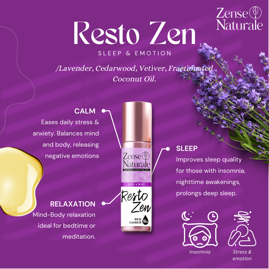 Resto Zen is a relaxing essential oil blend crafted with Lavender, Cedarwood, and Vetiver in a Fractionated Coconut Oil base. Its gentle, grounding aroma is ideal for unwinding after a long day, supporting a peaceful mood, and encouraging a restful night’s sleep.