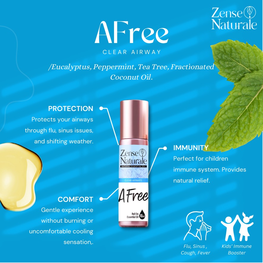 Afree is a refreshing essential oil blend formulated with Eucalyptus, Peppermint, and Tea Tree in a Fractionated Coconut Oil base. Its crisp and cooling aroma helps invigorate your senses and promotes a sense of open, clear airways—perfect for travel, work, or daily self-care.